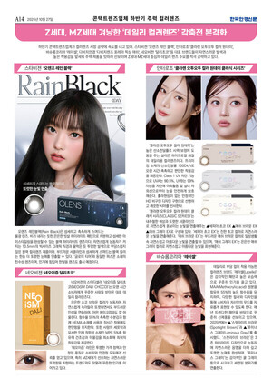 하반기 콘택트렌즈업계가 컬러렌즈 시장 공략에 속도를 내고 있다. 스타비젼 ‘오렌즈 레인 블랙’, 인터로조 ‘클라렌 오투오투 컬러 원데이’, 바슈롬코리아 ‘레이셀’, 다비치안경 ‘다비치렌즈 포레아 픽싱 애쉬’, 네오비젼 ‘달리초코’ 등 대표 브랜드들이 자연스러운 발색과 높은 착용감을 앞세워 주력 제품을 잇따라 선보이며 Z세대·MZ세대 중심의 데일리 렌즈 수요를 적극 공략하고 있다.스타비젼 ‘오렌즈 레인 블랙’오렌즈 레인블랙(Rain Black)은 섬세하고 촉촉하게 스며드는 물광 렌즈. 비가 내리는 듯한 은은한 빗살 하이라이트 패턴으로