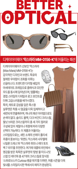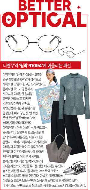 디엠무역의 ‘림락 R1094’는 오벌형 안구 실루엣을 림락만의 감각으로 재해석한 모델이다. 고급스러우면서도 클래식한 무드가 공존하며, 시그니처 디테일인 일체형 코받침 ‘새들노즈’ 디자인 덕분에 무심하게 걸쳐도 자연스럽게 세련된 분위기를 완성한다. 마치 꾸민 듯 안 꾸민 듯한 꾸안꾸(Effortless Chic) 스타일링을 가능하게 하는 아이템이다.이에 어울리는 패션으로는 몸선을 따라 유연하게 흐르는 슬림한 핏의 ‘메무아 샤론 슬림 니트 가디건’ 멜란지 그레이가 제격이다. 단독 착용은 물론 이너 아이템으로도 활용도가 높으며, 여기에