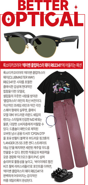 룩소티카코리아의 ‘레이밴 클럽마스터 웨이(CLUBMASTER WAY) RB2341’은 시대를 초월한 클래식한 감성에 현대적인 힙함을 더한 모델로, 셀럽들의 꾸준한 사랑을 받아온 ‘클럽마스터’ 라인의 최신 버전이다.직선적인 프레임 라인과 약간 각진 스퀘어 형태의 실루엣, 클래식 모델 대비 부드러운 라운드 쉐입의 렌즈는 스타일에 민감한 MZ세대는 물론, 다양한 소비자층에게 어필할 수 있다. 가볍고 견고한 아세테이트와 메탈 소재의 혼합 프레임은 우수한 착용감을 제공하며, 다양한 프레임 및 렌즈 컬러 옵션을 통해 나만의 개성을 표현할 수