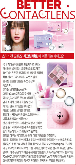 국내 최대 콘택트렌즈 프랜차이즈 ㈜스타비젼의 ‘오렌즈 시크릿 틴트(SECRET TINT)’는 은은한 하이라이트 패턴을 적용해 착용 시 어느 각도에서도 자연스럽게 빛나는 눈빛을 연출할 수 있는 것이 특징이다. 컬러는 브라운(Brown)과 그레이(Gray) 2종으로 구성돼 있으며, 각기 다른 무드의 매력을 담아 소비자 선택의 폭을 넓혔다.시크릿 틴트 브라운은 부드럽고 따뜻한 소프트 브라운 컬러로, 일상에서 자연스러운 포인트를 원하는 이들에게 적합한 제품이다. 반면 시크릿 틴트 그레이는 차갑고 신비로운 쿨톤 그레이로 세련되고 특별한 눈빛