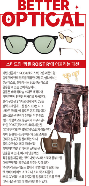 카린 선글라스 ‘ROIST(로이스트) R’은 라운드형 실루엣에 변색렌즈를 적용한 모델로, 실외에서는 선글라스로, 실내에서는 틴트 선글라스로 활용할 수 있는 것이 특징이다. 템플은 베타 티타늄 소재로 제작되어 가벼우면서 편안한 착용감을 제공한다. 컬러 구성은 2가지로 전개되며, C2는 블랙 프레임에 그린 렌즈, C3는 다크 브라운 프레임에 옐로우 렌즈 조합이다. 모든 모델은 변색이 진행된 이후 렌즈 컬러가 블랙으로 동일하게 마무리된다. ‘카린 ROIST(로이스트) R’의 세련된 디자인은 다양한 룩에 자연스럽게 어울린다. 특히, 몸판에