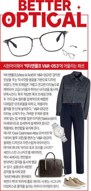 빅터앤롤프(Viktor & Rolf)의 ‘V&R-053’은 비즈니스 미팅이나 면접, 특별한 기념일과 같이 격식이 필요한 자리에서 신뢰감 있고 세련된 이미지를 연출하기 위한 최고의 선택이다.‘V&R-053’은 강직한 인상을 주는 직사각형 앵글을 기반으로 디자인되었다. 전체 프레임은 가볍고 견고한 티타늄으로 제작되어 고급스러움과 뛰어난 내구성을 동시에 만족시킨다. 특히 적당한 폭의 프레임 안에 두 가지 금속 컬러를 입체적으로 배합한 디테일은 단조로움을 피하고, 착용자의 품격을 한 단계 높여준다.이 안경의 진가는 포멀한 룩과 함께할 때