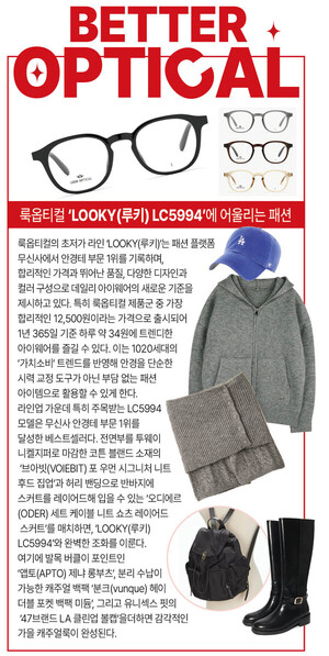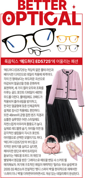 작은 프레임 하나가 바꾼 세상의 시선, 『BETTER OPTICAL』은 아이웨어를 패션의 언어로 풀어내며 트렌드의 흐름을 기록해왔다. 각 브랜드의 개성과 시즌별 스타일링을 통해 안경·선글라스의 새로운 미학을 제시하고, 『BETTER CONTACTLENS』 시리즈로 렌즈와 뷰티의 조화까지 아우른 BETTER OPTICAL의 여정—그 감각의 하이라이트를 다시 만나보자. 룩옵틱스 ‘에드하디 ED5725’에 어울리는 패션에드하디 ED5725’는 적당히 얇은 뿔테 라인과 베이식한 디자인으로 데일리 착용에 제격이다.각이 진 형태보다는 부드러운