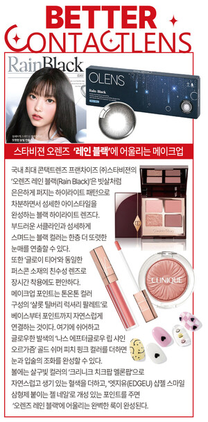 국내 최대 콘택트렌즈 프랜차이즈 ㈜스타비젼의 ‘오렌즈 레인 블랙(Rain Black)’은 빗살처럼 은은하게 퍼지는 하이라이트 패턴으로 차분하면서 섬세한 아이스타일을 완성하는 블랙 하이라이트 렌즈다.섬세하고 촉촉하게 스며드는 물광 렌즈로 자연스럽게 눈동자가 커지는 13.5mm의 빅사이즈 그래픽 직경과 물먹은 듯 투명한 발색으로 부담스럽지 않은 블랙 렌즈이다. 부드러운 서클라인과 섬세하게 스며드는 블랙 컬러는 한층 떠 또렷한 눈매를 연출할 수 있다. 또한 ’글로이 티어‘와 동일한 퍼스콘 소재의 친수성 렌즈로 장시간 착용에도 편안하며,