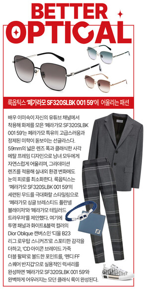 배우 이미숙이 자신의 유튜브 채널에서 착용해 화제를 모은 ‘페라가모 SF320SLBK 001 59’는 페라가모 특유의 고급스러움과 정제된 미학이 돋보이는 선글라스다. 59mm의 넓은 렌즈 폭과 클래식한 사각 메탈 프레임 디자인으로 남녀 모두에게 자연스럽게 어울리며, 그라데이션 렌즈를 적용해 실내외 환경 변화에도 눈의 피로를 최소화한다. 기본 블랙 컬러 외에도 템플 부분에 컬러 포인트를 더한 SF320SLBK 710, SF320SLBK 770 등 총 3가지 컬러로 구성돼 다양한 스타일링이 가능하다.룩옵틱스는 ‘페라가모 SF320SLB