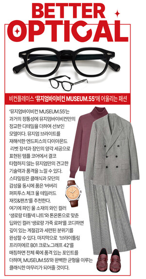 ‘뮤지엄바이비컨 MUSEUM.55’는 과거의 정통성에 뮤지엄바이비컨만의 정교한 디테일을 더하여 선보인 모델이다. 뮤지엄 브라이트를 재해석한 엔드피스의 다이아몬드 리벳 장석과 장인의 양각 세공으로 표현된 템플 코어에서 결코 타협하지 않는 뮤지엄만의 견고한 기술력과 품격을 느낄 수 있다. 슬림해진 템플 두께로 얼굴을 감싸는 듯한 피팅감이 착용자로 하여금 편안함과 스타일 두 마리 토끼를 잡는 모델이라 할 수 있다. 스타일링은 클래식과 모던의 감성을 동시에 품은 ‘버버리 퍼피투스 체크 울 테일러드 재킷&팬츠’를 추천한다. 경량 울 플란넬