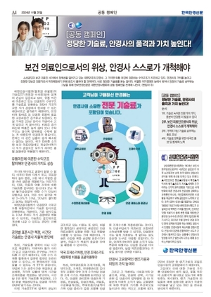 [공동캠페인] 정당한 기술료, 안경사의 품격과 가치 높인다!□ 1부. 전문가로서 기술로 승부할 수 있는 여건 마련해야□ 2부. 보건 의료인으로서의 위상, 안경사 스스로가 개척해야□ 3부. 가격이 아닌 기술로 승부하는 풍토 조성 □ 4부. 기술료 정착을 위한 대국민 홍보 및 법제화 노력소상공인과 보건 의료인 사이에서 정체성을 잃어가고 있는 대한민국의 안경사. 그 기저엔 유통 마진에 의존하는 수익구조가 자리하고 있다. 안경사의 가치를 높이고 진정한 안보건 전문가로서 자리매김하기 위해 반드시 풀어야 할 과제. 바로 정당한 기술료를 받는