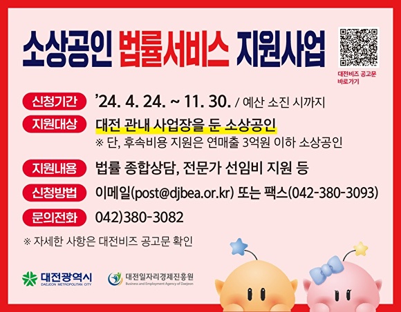 대상은 대전에 사업장을 둔 소상공인이며, 변호사, 세무사 등 20명 내외 법률 전문가로 구성된 자문단이 상담, 서식 작성, 소송·분쟁조정 등을 지원한다.