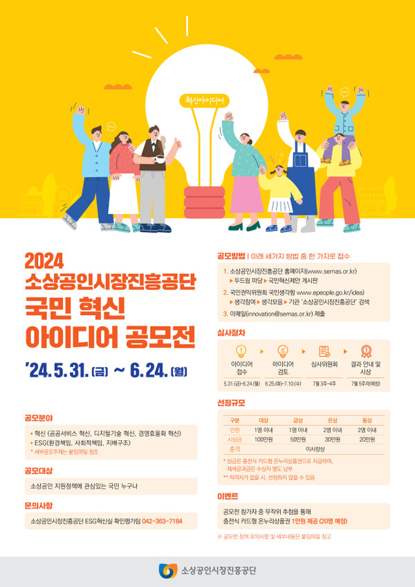 소상공인시장진흥공단(이사장 박성효)이 오는 24일까지 소상공인과 전통시장 활성화를 위한 ’2024 국민 혁신아이디어 공모전‘을 개최한다.