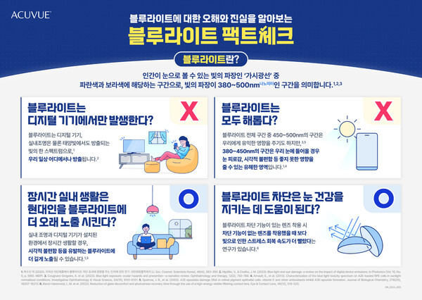 한국존슨앤드존슨 비전의 콘택트렌즈 브랜드 아큐브가 디지털 스크린과 인공 조명의 과도한 노출 속에 살아가는 현대인의 눈 건강을 위해 블루라이트에 대한 오해와 진실을 알아보는 인포그래픽 ‘블루라이트 팩트체크’를 최근 공개했다.
