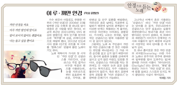 그나저나 어째서 흔히 사용하는 ‘선글라스’ 대신 ‘까만 안경’이라는 단어를 쓴 걸까. 우리나라에서 선글라스는 안구 보호라는 실용적 측면만큼이나 멋내기용 패션 아이템이라는 인식이 강하다. 또 외래어의 세련된(?) 이미지가 전체적인 가사와 어울리지 않기 때문에 비교적 더 서정적인 국어 단어를 쓴 게 아닐까 싶다.