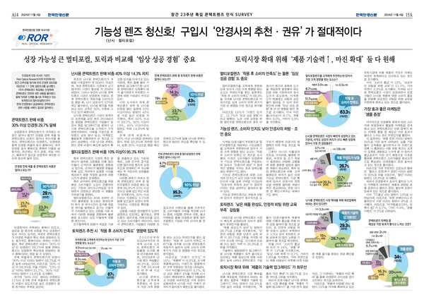 안경업계 전문 리서치 기관인 Real Optical Research(이하 ROR)에서는 창간 23주년을 맞이해 전국 안경원 300곳을 대상으로 1:1 전화 설문조사를 실시했다. 1주차 콘택트렌즈 특집에는 안경원에 콘택트렌즈 전반에 대한 내용을 물어봤다. 올해 잇따른 신제품 출시로 주목받고 있는 토릭렌즈와 멀티포컬렌즈까지 현재 안경원에서 궁금해하는 콘택트렌즈 관련 사항을 서베이 결과로 알아본다.