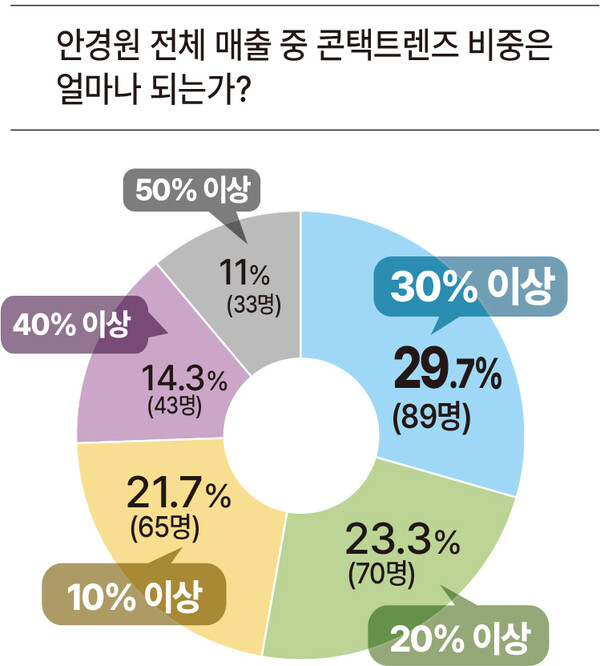 안경원마다 주력하는 품목이 다르고, 숍인숍 등 렌즈에 비중을 두는 안경원이 있어 차이는 있지만, 여전히 콘택트렌즈가 안경원 매출의 핵심 축을 담당하고 있는 필수적인 품목이라는 데에는 이견이 없다. 특히 콘택트렌즈 비중이 ‘30% 이상’인 안경원이 29.7%에 달해 콘택트렌즈는 안경원의 핵심축을 담당하는 필수 품목이라는 것을 알 수 있었다.