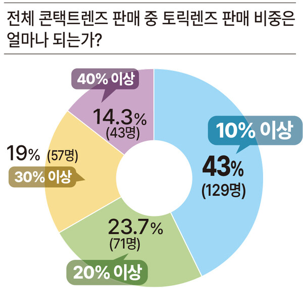 이번 조사에서 전체 콘택트렌즈 판매 중 난시용 비중을 묻는 질문에 10% 이상이라는 답변이 43%로 가장 높은 비중을 차지했다. 특히 20% 이상이 23.7%, 30% 이상이 19%, 40% 이상이라는 답변도 무려 14.3%에 달했다.