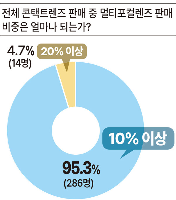 이러한 분위기 속에서 전체 콘택트렌즈 판매 중 멀티포컬렌즈 비중을 묻는 질문에 95.3%가 10% 이상이라고 답해 압도적인 비중을 차지했으며, 20% 이상이라는 안경원도 4.7%에 달해 앞으로의 성장이 더욱 기대되는 시장임을 확인할 수 있다.