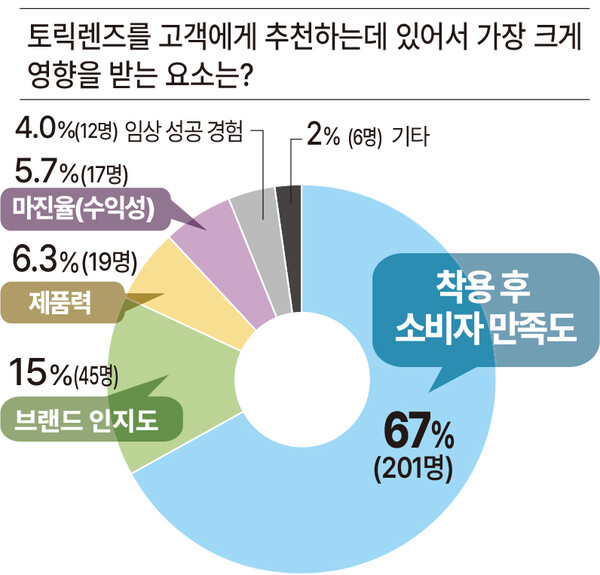난시용 콘택트렌즈를 고객에게 추천하는 데 있어서 가장 크게 영향을 받는 요소는 무엇인지를 묻는 질문에는 ‘착용 후 소비자 만족도’가 67%를 차지해 난시용 콘택트렌즈 착용자가 늘면서 실제 소비자 만족 후기가 가장 큰 영향을 미친 것으로 분석된다.