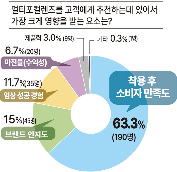 멀티포컬렌즈를 고객에게 추천하는데 있어서 가장 크게 영향을 받는 요소는 무엇인지를 묻는 질문에는 ‘착용 후 소비자 만족도’가 63.3%를 차지해 난시용 콘택트렌즈와 마찬가지로 실제 소비자 만족 후기가 가장 큰 영향을 미친 것으로 분석됐다.