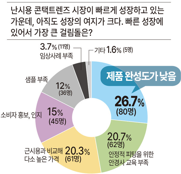 ‘제품 완성도가 낮다’는 답변이 26.7%로 1위를 차지했으며, ‘안정적 피팅을 위한 안경사 교육 부족’이 20.7%로 2위를 차지한 데 이어 근소한 차이로 ‘근시용과 비교해 다소 높은 가격’이 20.3%로 3위를 차지했다.