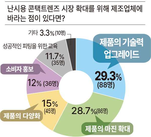 난시용 콘택트렌즈 시장 확대를 위해 제조업체 차원에서 바라는 점을 묻는 질문에 ‘제품의 기술력 업그레이드’라는 답변이 29.3%로 가장 높은 비중을 차지했으며, ‘제품의 마진 확대’가 28.7%로 근소한 차이로 2위를 차지했다.
