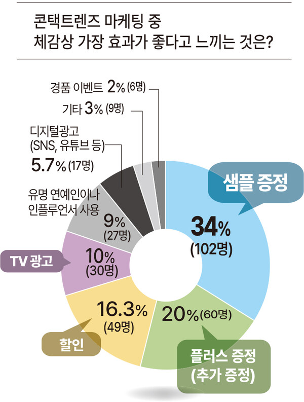 다음으로 가장 직접적인 프로모션 형태인 ‘플러스 증정(추가 증정)’이라는 답변이 20%로 뒤를 이었으며, ‘할인’이라는 답변도 16.3%로 조사됐다.