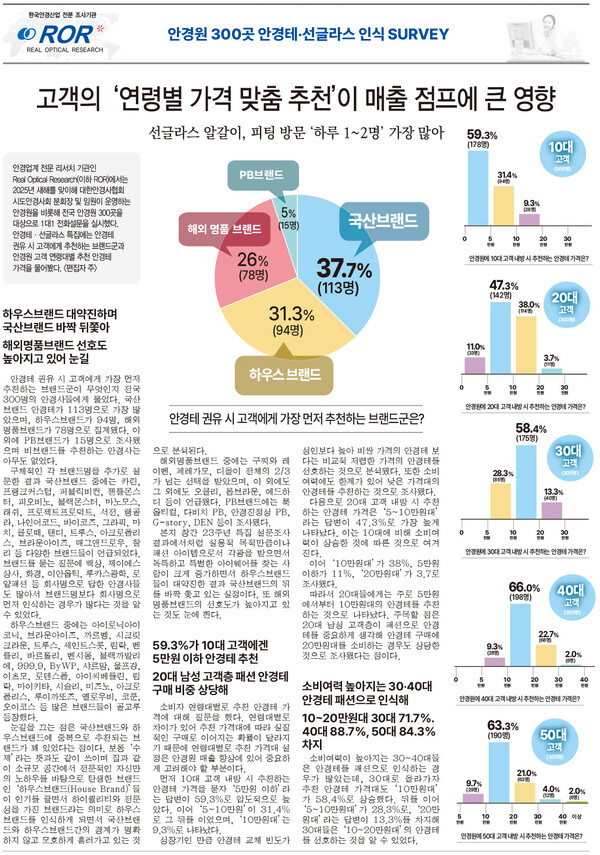 안경업계 전문 리서치 기관인 Real Optical Research(이하 ROR)에서는 2025년 새해를 맞이해 대한안경사협회 시도안경사회 분회장 및 임원이 운영하는 안경원을 비롯해 전국 안경원 300곳을 대상으로 1대1 전화설문을 실시했다. 안경테·선글라스 특집에는 안경테 권유 시 고객에게 추천하는 브랜드군과 안경원 고객 연령대별 추천 안경테 가격을 물어봤다. <편집자 주>