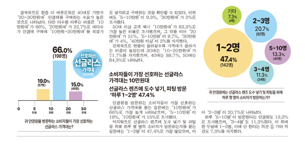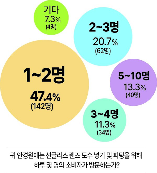 마지막으로 선글라스 렌즈에 도수 넣기 및 피팅을 위해 하루 몇 명의 소비자가 방문하는지를 묻는 질문에는 ‘1~2명’이 47.4%로 가장 많았으며, 이어 ‘2~3명’이 20.7%로 나타났다.