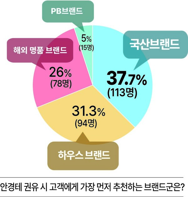 안경테 권유 시 고객에게 가장 먼저 추천하는 브랜드군이 무엇인지 전국 300명의 안경사들에게 물었다. 국산브랜드 안경테가 113명으로 가장 많았으며, 하우스브랜드가 94명, 해외 명품브랜드가 78명으로 집계됐다. 이 외에 PB브랜드가 15명으로 조사됐으며 비브랜드를 추천하는 안경사는 아무도 없었다.