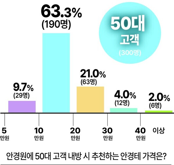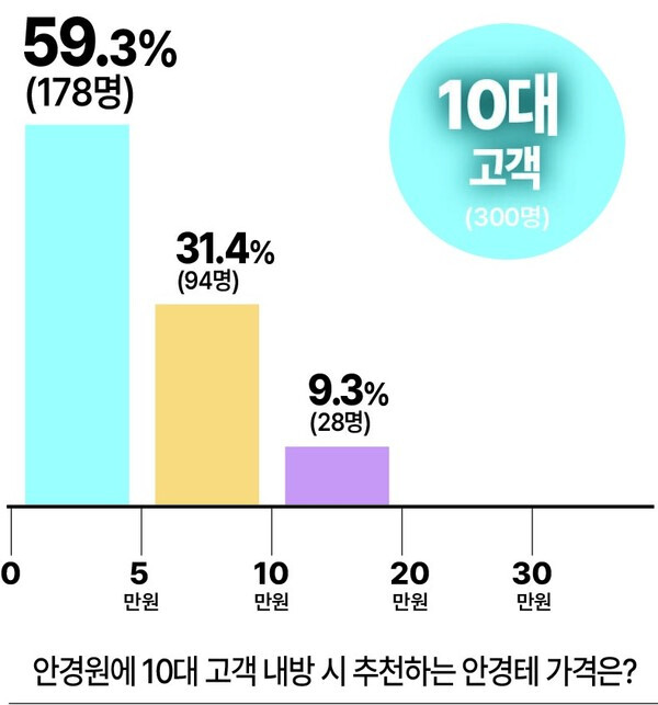 먼저 10대 고객 내방 시 추천하는 안경테 가격을 묻자 ‘5만원 이하’라는 답변이 59.3%로 압도적으로 높았다. 이어 ‘5~10만원’이 31.4%로 그 뒤를 이었으며, ‘10만원대’는 9.3%로 나타났다.
