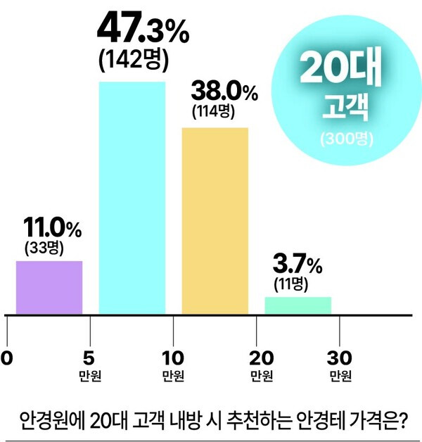 다음으로 20대 고객 내방 시 추천하는 안경테 가격은 ‘5~10만원대’라는 답변이 47.3%로 가장 높게 나타났다. 이는 10대에 비해 소비여력이 상승한 것에 따른 것으로 여겨진다.