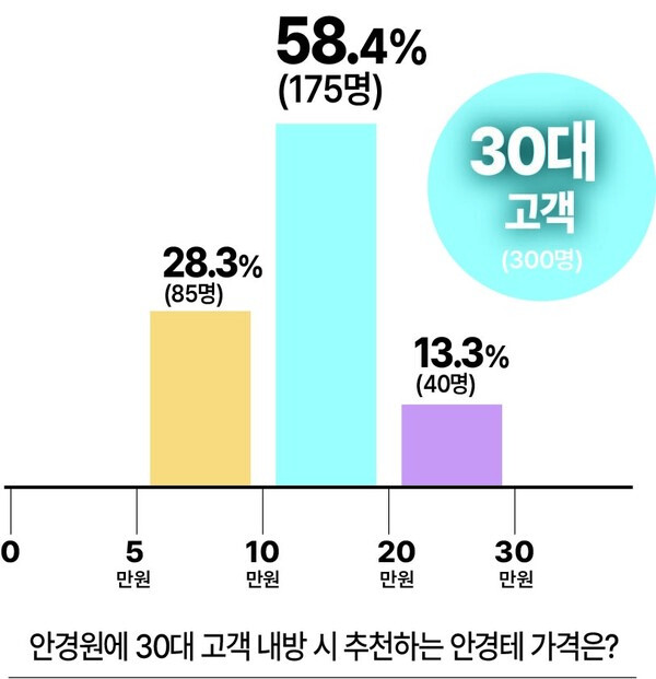 소비여력이 높아지는 30~40대들은 안경테를 패션으로 인식하는 경우가 많았는데, 30대로 올라가자 추천 안경테 가격대도 ‘10만원대’가 58.4%로 상승했다. 뒤를 이어 ‘5~10만원대’가 28.3%로, ‘20만원대’라는 답변이 13.3%를 차지해 30대들은 ‘10~20만원대’의 안경테를 선호하는 것을 알 수 있었다.
