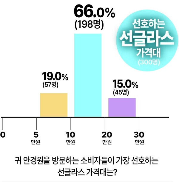 안경원을 방문하는 소비자들이 가장 선호하는 선글라스 가격대를 묻는 질문에는 ‘10만원대’가 66%로 가장 높게 나타났으며, ‘5~10만원’이 19%, ‘10만원대’가 15%로 조사됐다.