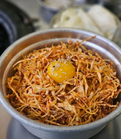 이어 기본 반찬이 함께 제공되는데, 다양한 곁들임 반찬 중에서도 특히 눈길을 끄는 것은 계란 노른자가 올라간 양배추 겉절이다.