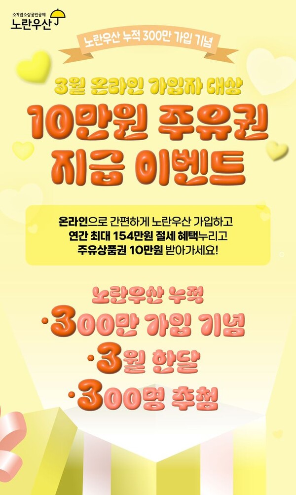 중앙회는 300만번째 노란우산 가입자와 3월 중 노란우산 홈페이지 또는 모바일 앱을 통해 가입한 고객 300명을 추첨해 10만원 주유상품권을 지급한다.