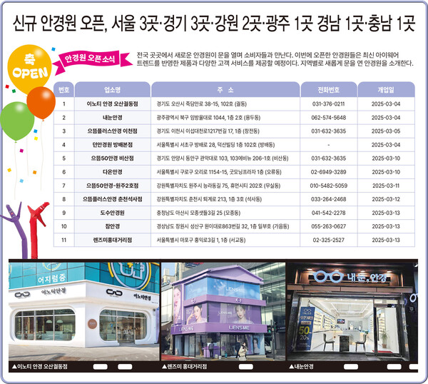 전국 곳곳에서 새로운 안경원이 문을 열며 소비자들과 만난다. 이번에 오픈한 안경원들은 최신 아이웨어 트렌드를 반영한 제품과 다양한 고객 서비스를 제공할 예정이다.