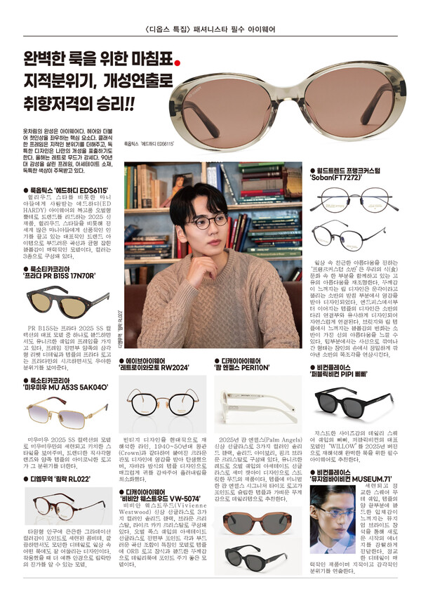 옷차림의 완성은 아이웨어다. 헤어와 더불어 첫인상을 좌우하는 핵심 요소다. 클래식한 프레임은 지적인 분위기를 더해주고, 독특한 디자인은 나만의 개성을 표출하기도 한다. 올해는 레트로 무드가 강세다. 90년대 감성을 살린 프레임, 아세테이트 소재, 독특한 색상이 주목받고 있다.