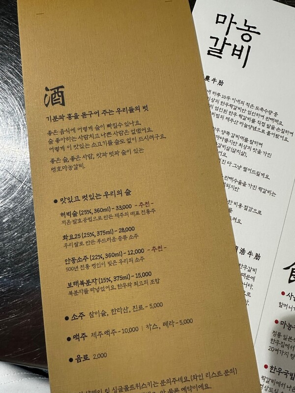 주류 메뉴에는 ‘술 좋아하는 사람치고 나쁜 사람은 없댔어요.’ 라는 문구가 적혀 있어 보는 이들을 웃음 짓게 한다.