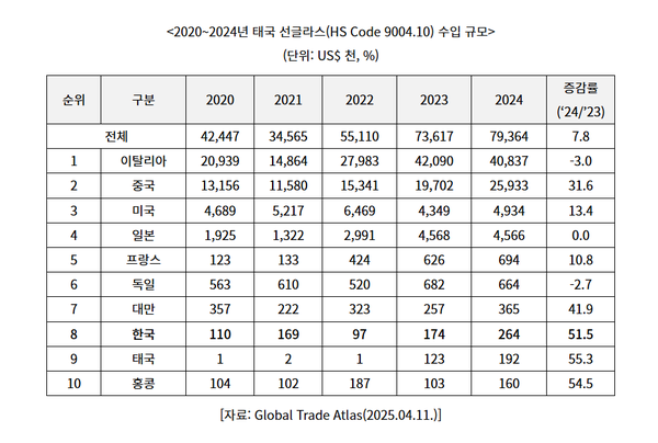 시장조사기관 Global Trade Atlas(GTA)에 따르면, 2024년 기준 태국의 선글라스(HS 코드: 9004.10 기준) 수입 금액은 7936만 달러로 전년 동기 대비 7.8% 증가했다. 최대 수입국인 이탈리아로부터의 수입은 전년 동기 대비 3% 감소했지만, 한국으로부터의 수입은 전년 동기 대비 51.5% 크게 증가하며 전체 수입국 중 8위를 차지했다.