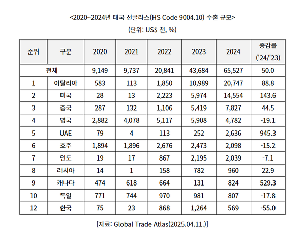 시장조사기관 Global Trade Atlas(GTA)에 따르면, 2024년 기준 태국 선글라스 수출액은 약 6553만 달러로 전년 동기 대비 50% 증가했다. 최대 수출국인 이탈리아로의 수출액이 약 2075만 달러로 전체의 31.7%를 차지했으며, 뒤이어 미국(약 1455만 달러), 중국(약 783만 달러), 영국(약 478만 달러) 순으로 집계됐다. 한편, 동기간 한국으로의 수출액은 약 57만 달러로, 전체 수출 비중의 약 1%를 차지하며 12위를 기록했다.