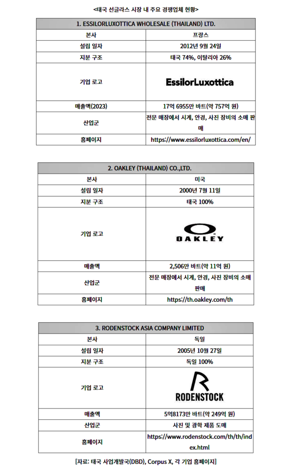태국 선글라스 시장은 글로벌 브랜드의 독점 구조가 강하게 나타나는 분야다. 태국 내 선글라스 시장 관련 업체는 2023년 기준 EssilorLuxottica Wholesale (Thailand), Kering, Oakley, Rodenstock 순으로 높은 점유율을 갖고 있다. 브랜드 기준으로는 Ray-Ban, Gucci, Oakley 순으로 높은 점유율을 확보하고 있으며, 고가 명품 브랜드를 선호하는 트렌드가 뚜렷하게 나타나고 있다.