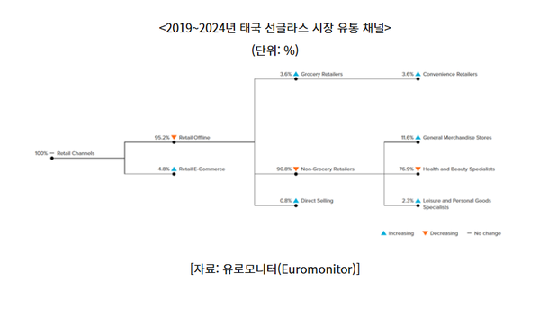 유로모니터에 따르면, 2024년 태국 선글라스 시장의 소매 판매 규모는 전년 대비 20% 증가한 약 57억 바트(약 2453억 원)를 기록했다.