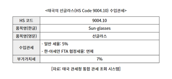 태국과 한국은 한-태 자유무역협정(FTA)을 체결하고 있어 일정 요건을 충족하면 관세 혜택을 받을 수 있다. 선글라스(HS 코드 900410)의 경우, FTA 원산지 증명서(Certificate of Origin)를 함께 제출할 경우 무관세로 수입이 가능하다.