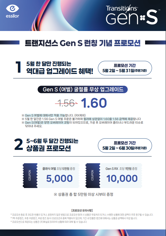에실로코리아는 ‘트랜지션스 Gen S’ 출시를 기념해 안경원을 대상으로 다양한 프로모션도 진행한다. 5월 2일부터 31일까지 Gen S 여벌 제품 구매 시 굴절률 1.56 렌즈를 1.60 렌즈로 무상 업그레이드하는 혜택을 제공한다. 또한, 6월 30일까지 두 달간 트랜지션스 클래식 제품 주문 시 조당 5천원, Gen S RX 제품 주문 시 조당 1만원 상품권을 증정한다.