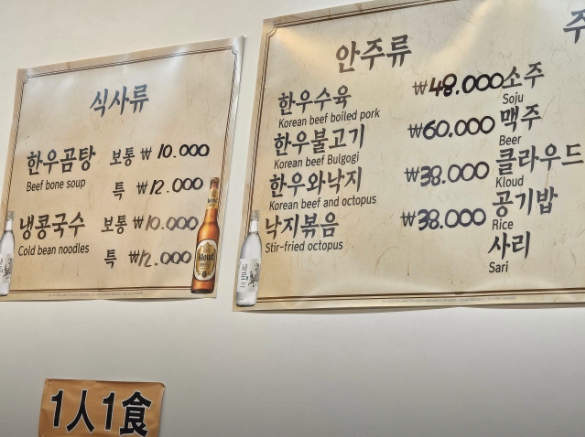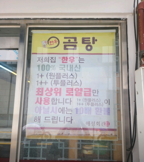 특히 벽면에는 ‘저희 집 한우는 100% 국내산 1+ 1++ 고기만 사용하며, 아닐 시 10배 환불해 드린다’라는 문구가 걸려 있어, 식재료에 대한 강한 자부심을 엿볼 수 있다.