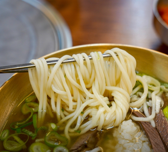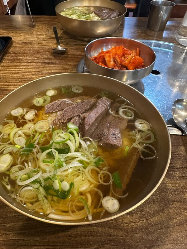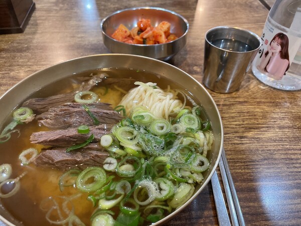 이곳의 곰탕은 일반적인 곰탕집과 달리 두툼한 한우 고기가 듬뿍 들어가 있으며, 중면과 파가 가득 더해져 있다.