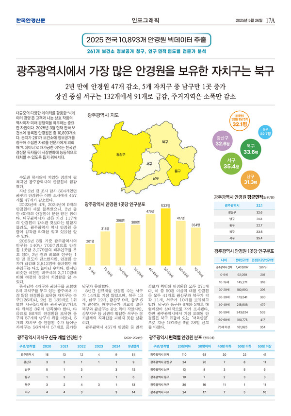 남구와 동구는 6개와 3개로 대형매장이 상대적으로 작게 조사됐다. 한편 광주광역시에서 가장 오래된 안경원은 북구 유동에 있는 ‘서독안경’으로 지난 1976년 6월 28일 신고를 마쳤다.