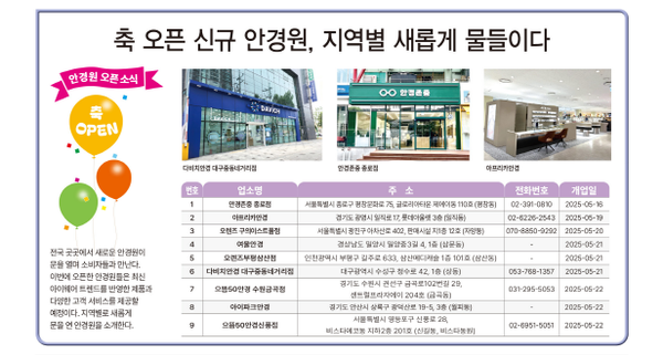 전국 곳곳에서 새로운 안경원이 문을 열며 소비자들과 만난다. 이번에 오픈한 안경원들은 최신 아이웨어 트렌드를 반영한 제품과 다양한 고객 서비스를 제공할 예정이다. 지역별로 새롭게 문을 연 안경원을 소개한다.