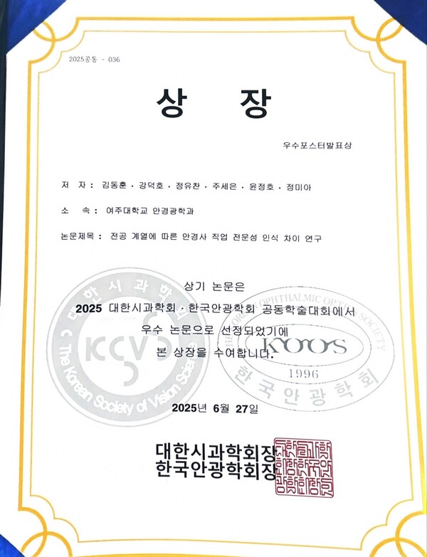 여주대학교 안경광학과(학과장 이기석)가 ‘2025 대한시과학회·한국안광학회 공동학술대회’ 포스터 세션에서 우수포스터발표상을 2편 수상하며 학문적 성과를 입증하였다.