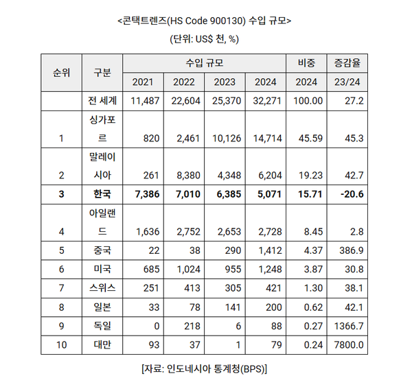 한편, 인도네시아 콘택트렌즈 수입은 2021년 1,148만7천 달러에서 2024년 3,227만1천 달러로 증가했다. 주요 수입국은 싱가포르(45.6%), 말레이시아(19.2%), 한국(15.7%) 순이다. 2021년 기준 한국이 최대 수입국이었으나, 최근 3년간 Alcon 제품 생산지인 싱가포르 및 말레이시아의 비중이 확대됐다.