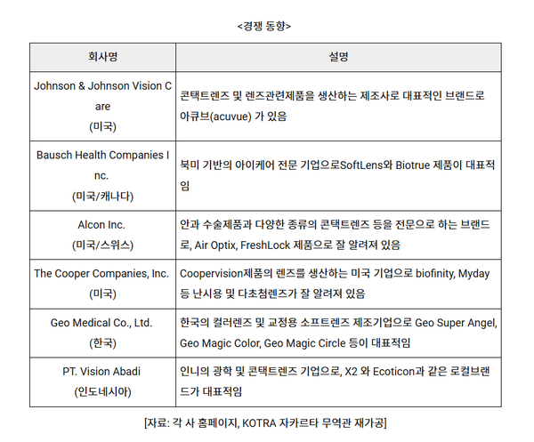 시장 내 주요 경쟁사는 Johnson & Johnson Vision Care(아큐브), Alcon(에어옵틱스), Bausch Health, CooperVision 등 글로벌 브랜드와 더불어, 인도네시아 로컬 브랜드인 PT. Vision Abadi(X2, Exoticon), 한국의 Geo Medical 등도 활발히 활동하고 있다.