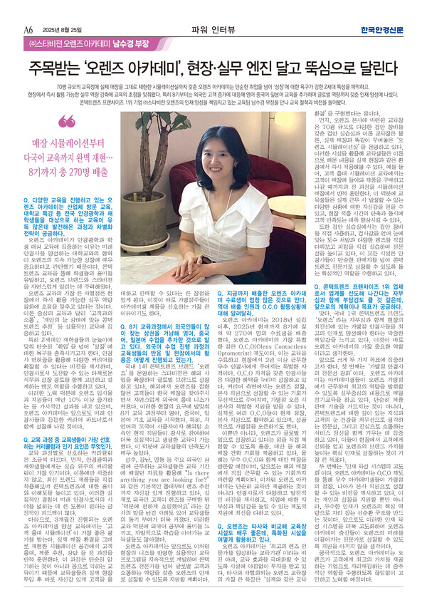 70평 규모의 교육장에 실제 매장을 그대로 재현한 시뮬레이션실까지 갖춘 오렌즈 아카데미는 단순한 취업을 넘어 ‘성장’에 대한 욕구가 강한 Z세대 특성을 파악하고, 현장에서 즉시 활용 가능한 실무 역량 강화에 교육의 초점을 맞춰왔다. 특히 8기부터는 외국인 고객 증가에 대응해 영어·중국어·일본어 교육을 추가하며 글로벌 역량까지 갖춘 인재 양성에 나섰다. 콘택트렌즈 프랜차이즈 1위 기업 ㈜스타비젼 오렌즈의 인재 양성을 책임지고 있는 교육팀 남수경 부장을 만나 교육 철학과 비전을 들어봤다.